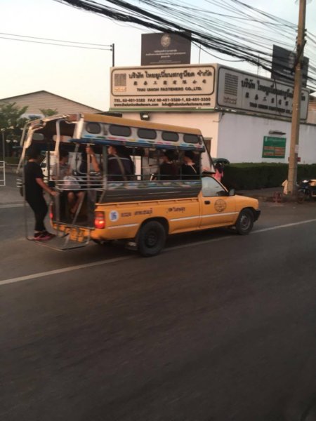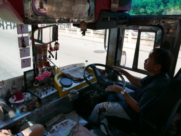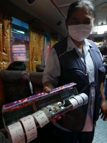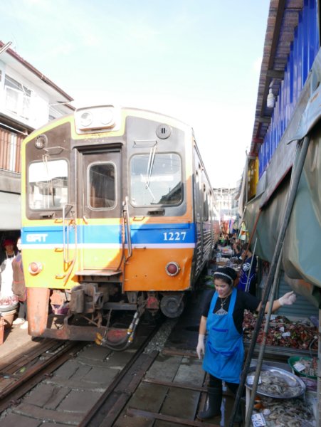 A hoteltől néhány perc sétára voltak buszmegállók, ezeknek a közlekedését azonban nem feltétlenül sikerült megfejtenünk: hiába van kiírva, nem áll meg, vagy megáll a belső sávban és fel kell rá ugranod miközben már el is indul, a buszvezetőtől nem lehet jegyet venni, de nincs minden buszon „buszasszisztens”. Szóval kicsit érthetetlen, érdemes jóval több időt rászánni, mint amennyi eredetileg lenne az út. Szóval a mi buszunk sem jött, hiába volt kiírva a megállóba. Egy kedves idegen érkezett a segítségünkre, aki megmutatta, helyette mire szállhatunk fel, ez nem más, mint egy ingyenes shuttle busz, ami a király halála miatt a szertartásra érkezőket szállítja a városban. Hogy erre bárki felszállhat vagy sem, nos azóta sem egyértelmű. Mi felszálltunk és megkértük a „buszasszisztenst”, hogy legyen kedves szólni, hol kell leszállnunk. Később észrevettük, hogy a nő bizony elaludt… Semmi gond. Sikerült még időben leugranunk a Victory Monument megállóban. Itt már nem volt olyan egyértelmű, honnan is indul a minibusz tovább. Körülbelül 2 héttel azelőtt olvastuk az információkat, hogyan is lehet eljutni a vonatpiacra, de azt mondták, az már bizony nem úgy van, nincsen közvetlen busz, át kell majd szállni. Megjött a minibusz, (ekkor még baromi furcsa volt, hogy ilyennel utazunk és 1 órát, pedig amiket 2-3 héttel később átéltünk az ilyen buszokon…). A fizetés úgy történt, hogy a sofőr hátraadott egy kis kosarat, ebbe kellett beletenni a pénzt. A leszállás pedig úgy, hogy valamit előre kell kiabálni neki, gondolom azt, hogy „állj” és remélhetőleg veszi a jelet.