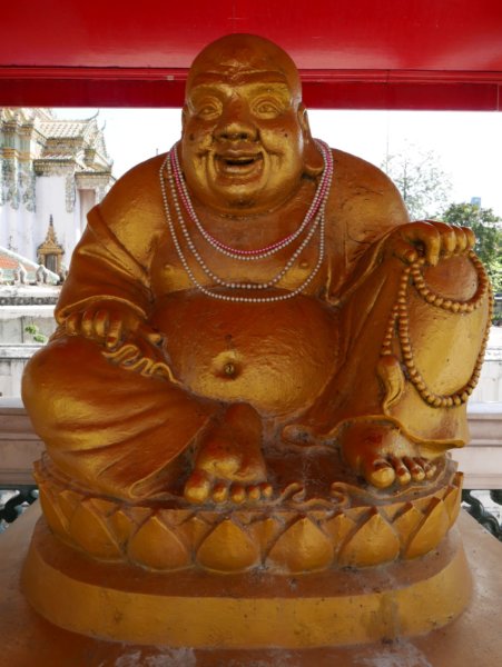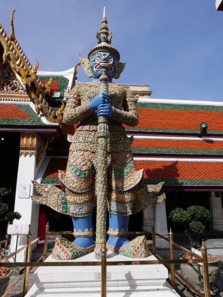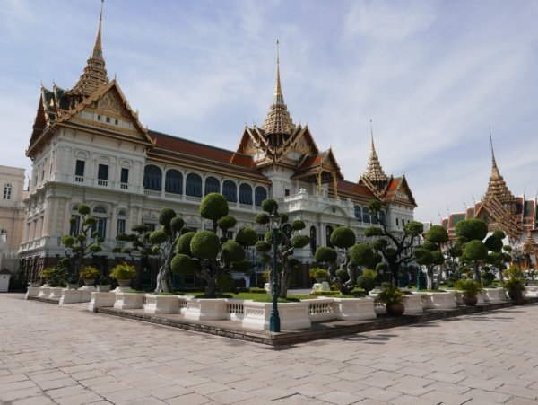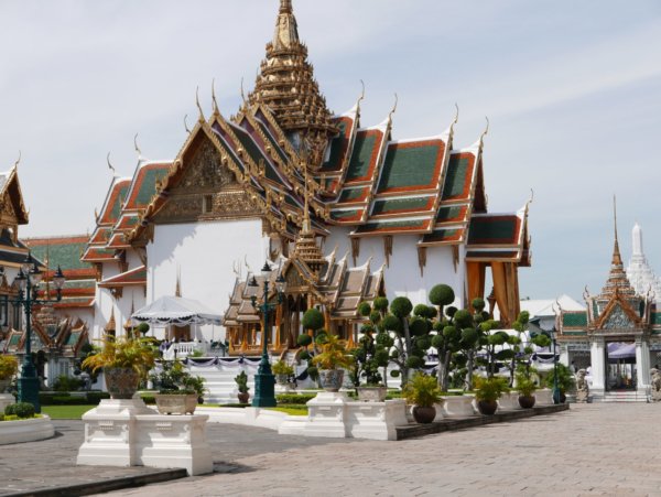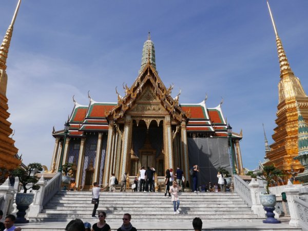 a szállásunktól gyalog is könnyen megközelíthető volt. A király halála miatt bizonyos részeit lezárták, és vélhetőleg ez egészen 2017 novemberéig így lesz, illetve naponta több ezren zarándokolnak a helyre, hogy imádkozzanak érte. Mikor azt mondom több ezer, akkor azt tényleg így is kell elképzelni. És mindenki ott ül feketében, csendben hosszú órákon keresztül, hogy bejusson (ami nekünk nagyon meglepő volt, hogy hűtött vizet és kókuszvizet osztogatnak az utcán emiatt, de nem csak nekik, hanem mindenkinek, sőt akik részt vettek a szertartáson, ebédet is kapnak). Belépni fedetlen térddel és vállal tilos, ha nem felelünk meg ennek, kölcsönözni kell kendőket. Hogy milyenek is ezek a templomok, inkább mutassák meg a képek
