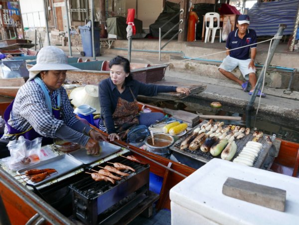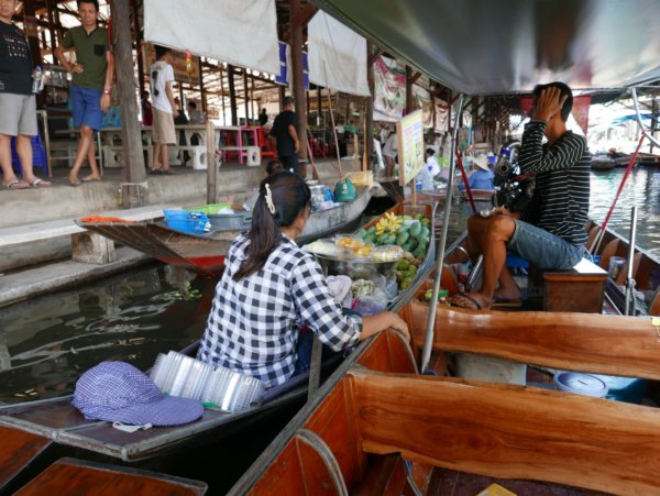 A sofőr szólt, hol kell leszállnunk. Meg is tettük, de úszópiacot nem leltünk. Kérdezősködtünk, érkezett is egy jelentkező, hogy ő majd megmutatja nekünk. Követtük. A kocsijánál kötöttünk ki. Minden blogban azt olvastam, hogy mennyire segítőkészek a thai emberek és sokszor akár a saját kocsijukkal is elvisznek az adott helyre, és nem fogadnak el érte pénzt. Szóval eddig még Ok is lehetne a dolog. Mondta, hogy elvisz és segít a csónakbérlésben is. Legyen. Azonban az offline térképünkön arra lettünk figyelmesek, hogy egyre csak távolodunk. Itt vagyunk a semmi közepén, és egy vadidegen kocsijában ülünk, aki nem tudjuk hová visz minket. Mondjuk amíg ezen nevetni tudunk, addig nagy baj nincsen. Kiderült, hogy ő egy másik úszópiacra gondolt, amiről egyébként tudtuk, hogy tényleg létezik, és az számít autentikusabbnak, de ezt mondhatta volna előtte is. Ahogy megérkeztünk már érkezett is két lány, akik kinyitották nekünk az ajtókat. Ekkor már sejtettük, hogy azért valami nem stimmel. Amikor azt mondom, hogy a semmi közepén voltunk, akkor az most tényleg így is volt. A sofőrünk gyorsan elhajtott. Ott álltunk teljesen kiszolgáltatva. A csónakbérlési árat irreálisan magasnak tartottuk (azt hiszem 2000 baht lett volna kettőnknek 1 óra) és azt mondták, a sofőr 2 óra múlva jön vissza. Hosszas alkudozás árán, de sikerült egy viszonylag jó árat kapnunk 40 percre. És nem bántuk meg, fantasztikus élmény volt. A házak a vízen, öreg nénik csónakban árulják a portékáikat. Annyira, de annyira hangulatos, kihagyhatatlan.