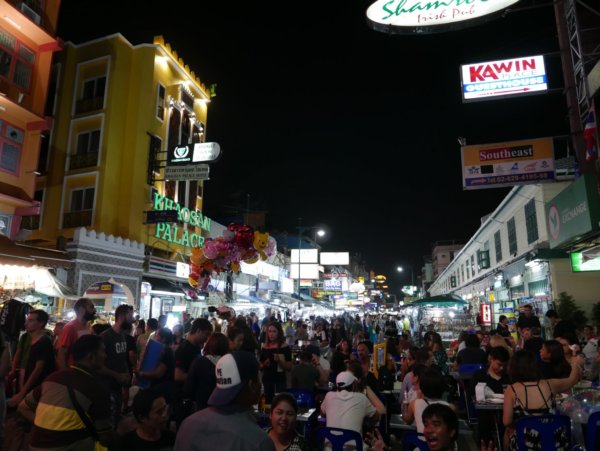 A Khao San Road, mint a hátizsákosok mekkája szerepel mindenhol, ezért egyértelmű volt, hogy itt próbálunk szállást foglalni, a KhaoSan Palace-ben szálltunk meg. Közlekedés és éjszakai pezsgés szempontjából tökéletes, valamint a hotel tetején van egy kis úszómedence is. Azonban alvás szempontjából már kevésbé, a szobákban nagyon durván lehet hallani a szórakozóhelyek üvöltő zenéjét. És ha már zene, egymás mellett a bárok, az egyikben mai elektronikus zene, közvetlenül vele szemben tradicionális muzsika és hömpölyög az embertömeg az utcán, árusok mindenhol és tolják az arcodba az öltönyt, a bogarat, a taxit, mindent, a teljes káosz.