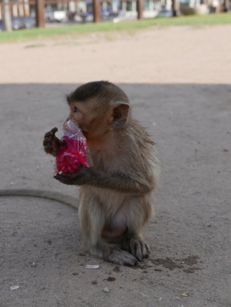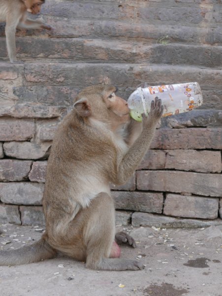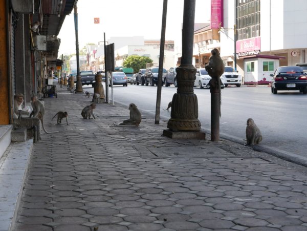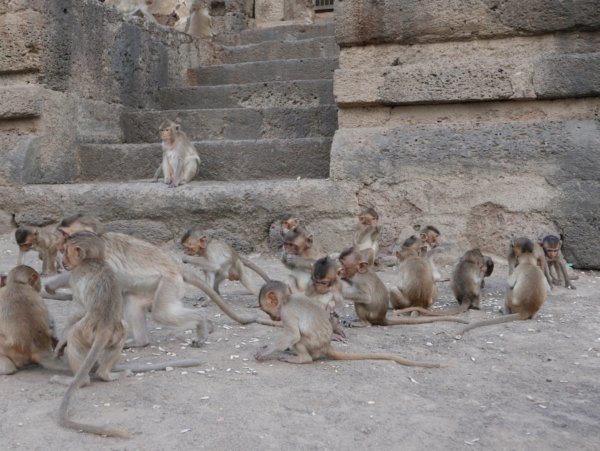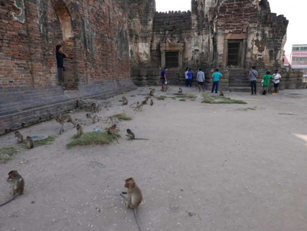 Ayutthayatol 1 óra távolságra van Lopburi, a város, ami arról híres, hogy szabadon élnek a majmok. Minibusszal könnyen és gyorsan megközelíthető. Hogy honnan indul a minibusz? Hát kb mindegyiket végig kell kérdezni, mire rálel az ember. De megtaláltuk. Ahogy a városban a majmokat is. Azt még nem is említettem, hogy a barátom viszonylag magas (magasabb, mint 2 méter), amit azért még sokan itthon is megjegyeznek, hát akkor még a thai emberek (ahol az átlag férfimagasság kb 170 cm). Mindezt csak azért mesélem, mert amíg ő a majmokat fényképezte, addig a turisták meg vele akartak fotózkodni. Viszont ezt én már csak tőle hallottam, ugyanis én inkább próbáltam elkerülni a majmokat és minél inkább távolodni a kolóniától. Ahogy egyszer az egyik megpróbált felmászni a lábamra, én úgy megijedtem, hogy menekülőre fogtam.